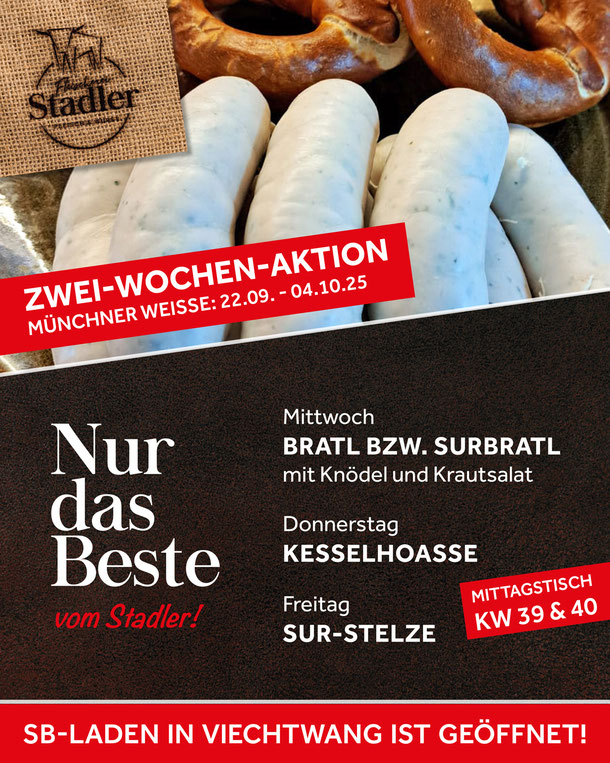 Bei uns gibts jede Woche eine Aktion mit frischen Fleisch und Wurstspezialitäten aus eigener Produktion.
